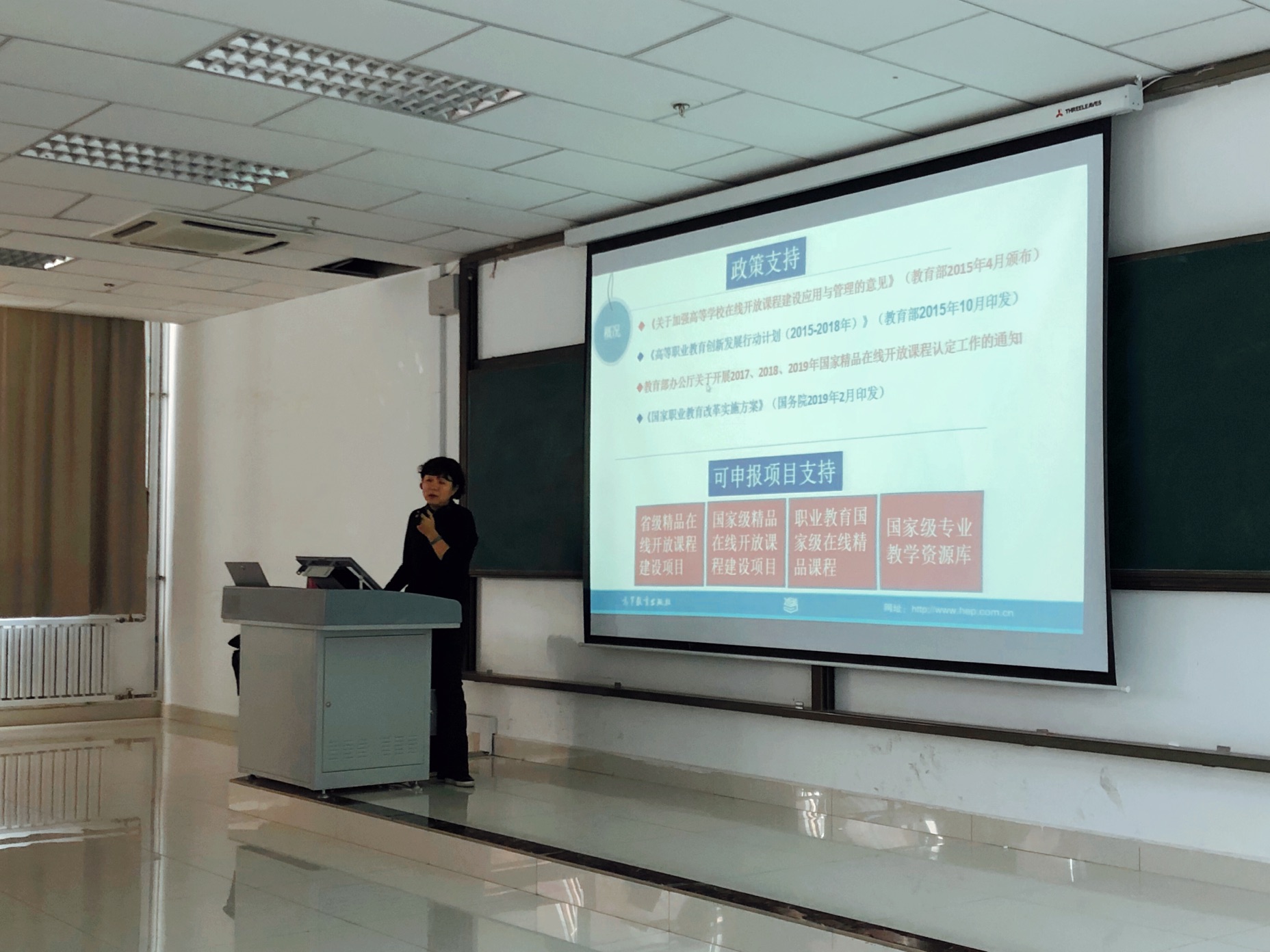 为认真贯彻落实教育部《高等职业教育创新发展行动计划》,结合教育部《关于加强高等学校在线开放课程建设应用与管理的意见》以及教育部在线开放课程建设与应用推进会的有关精神,顺应高等职业教育“互联网+”发展趋势,强化信息技术在职业教育专业教学改革与教学实施领域的综合应用。推进在线开放课程及混合式教学在职业院校的开展,提升教师应用优质资源开展信息化教学的能力与水平,构建个性化、智能化、 数字化、泛在化职业教育课堂学习新生态,2019年10月11日上午高教社的三位领导、专家来到我院进行了“职业院校精品在线开放课程建设与信息化实践教学讲座”的相关培训。