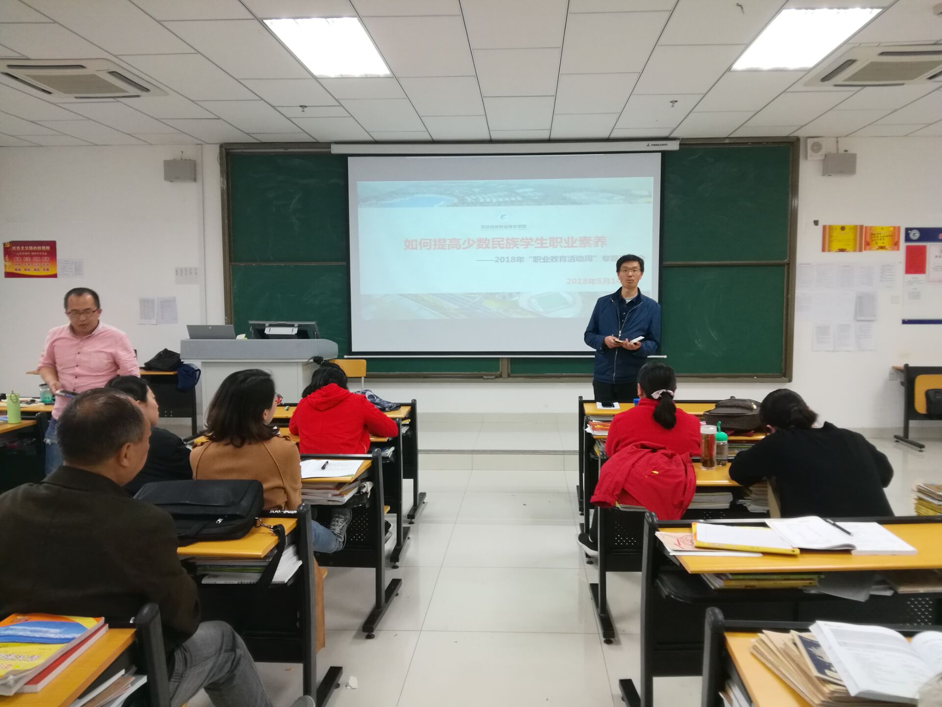 为进一步提高我院少数民族学生MHK过级率和国语水平,加强学院MHK教师教学能力,作为学院2018年“职业教育活动周”的一部分,2018年5月14日下午,教务处与基础教学部开展了以“如何提高少数民族学生职业素养”为题的专题研讨会。教务处赵磊、李依蕾和基础教学部的14名教师参加了此次座谈。