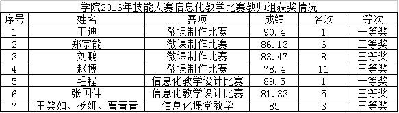经过激烈角逐,我院教师精心设计,精选适合于体现多媒体技术优势的教学内容,取得了优异的成绩。现将名次公布如下,对各位获奖教师表示祝贺的同时,也希望今后有更多的年青教师能积极参与到这类的活动中去,进一步提高我校信息化教学的水平。