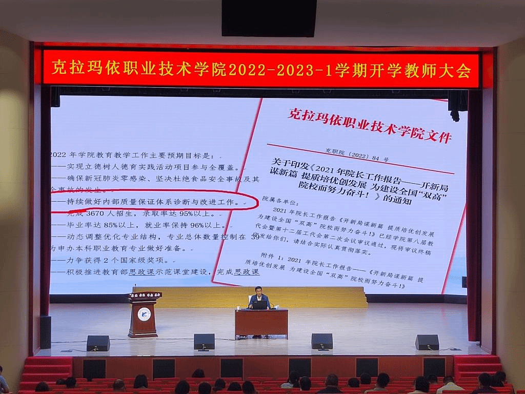 2022年8月26日,我院在克拉玛依校区召开了2022-2023-1学期开学教师大会。学院党委副书记、院长付梅莉,教务处副处长马哈木提江·米吉提,评估督导办主任赵磊以及全体教师出席了本次大会。大会由教务处马哈木提江·米吉提副处长主持。