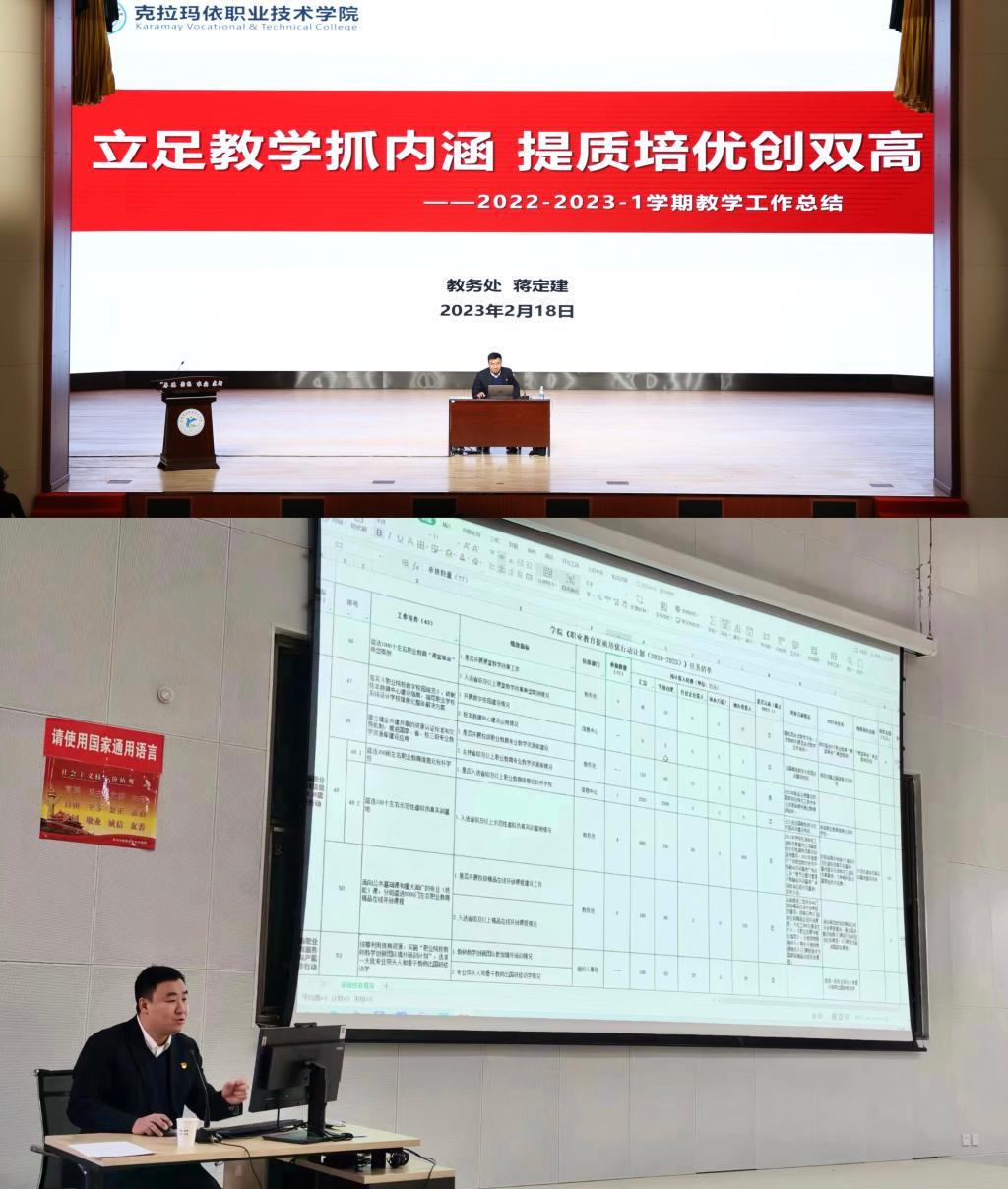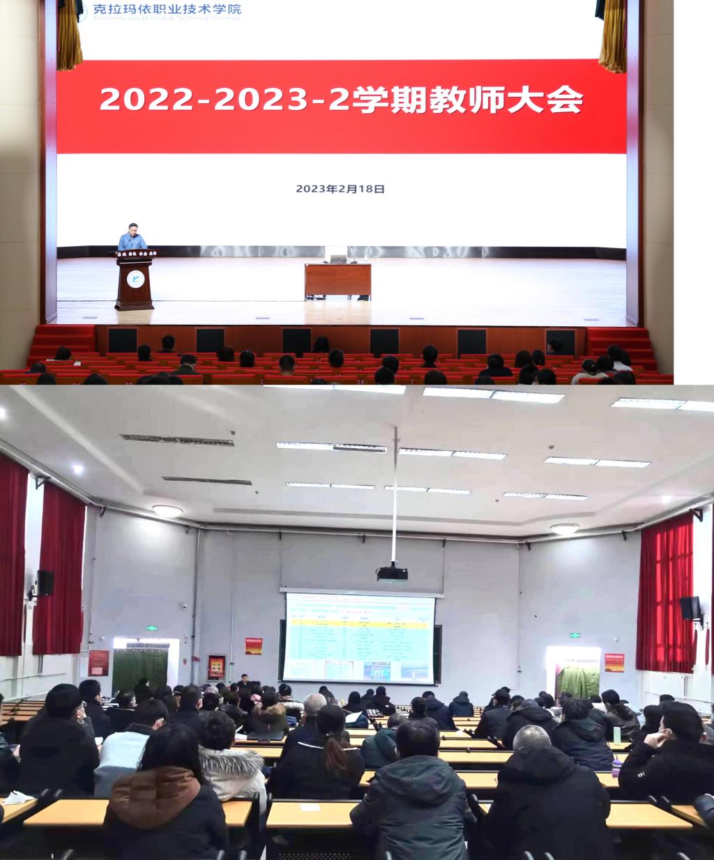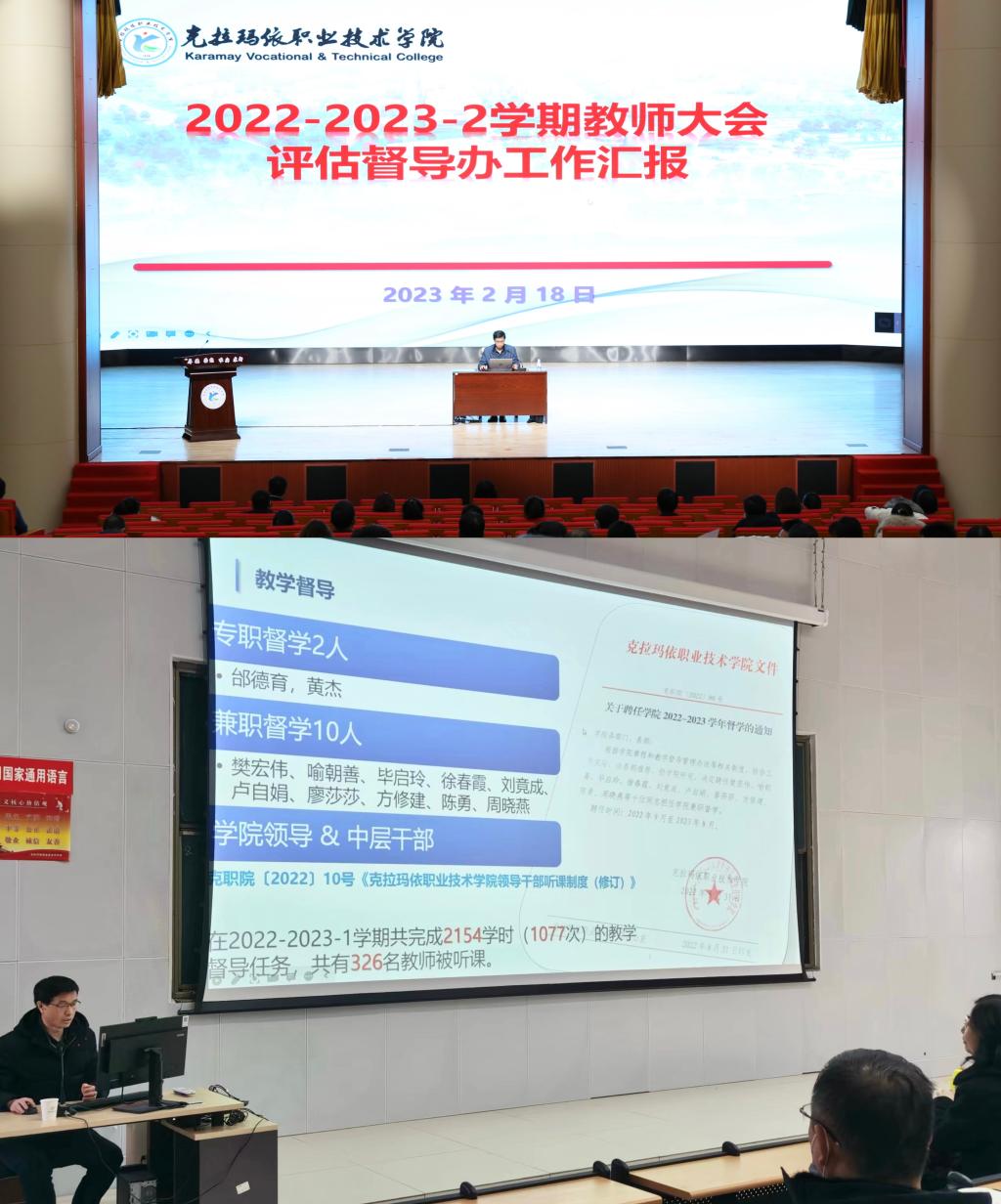 启新征程,砥砺谱新篇。2月18-2月19日,学院分别在克拉玛依校区和独山子校区召开2022-2023-2学期教师大会。学院党委委员、副院长刘旭莹,教务处处长蒋定建,评估督导办主任赵磊以及全体教师参加了本次大会。大会由教务处副处长马哈木提江·米吉提主持。