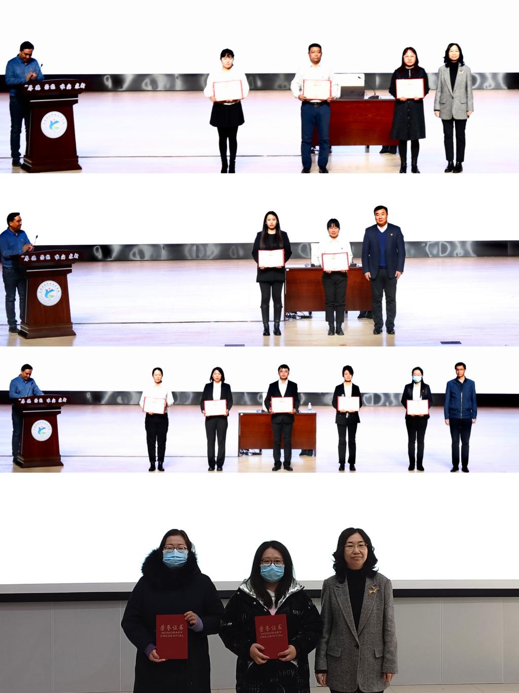 大会第三项,对学院2022-2023-1学期院级课程思政教学案例大赛中获得一、二、三等奖的12位老师进行了表彰,学院领导向获奖个人颁发荣誉证书。