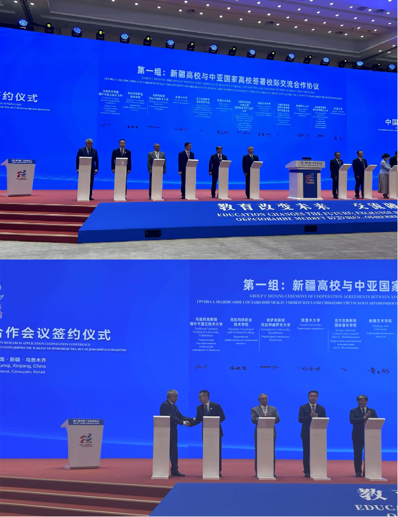 在中国-中亚产学研用合作会议签约仪式上,克拉玛依职业技术学院院长安熠哲与乌兹别克斯坦塔什干国立技术大学电气自动化学院院长海鲁拉·齐克里拉耶夫上台共同签署校际交流合作协议。两校将在教学科研人员培训、师生交流互访、开展联合科研项目攻关等方面加强合作。
